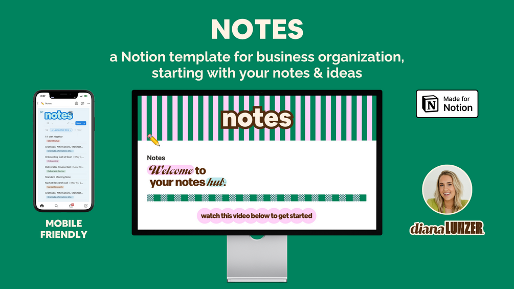 This Notion Notes template is your digital catch-all for everything, ideas, meeting notes, client calls, and more. Ditch the paper clutter and keep it all in one streamlined, easy-to-use space. Whether you’re new to Notion, or a total pro, you’ll love the time-saving templates, clean structure, and simple organization that helps you find what you need, fast.